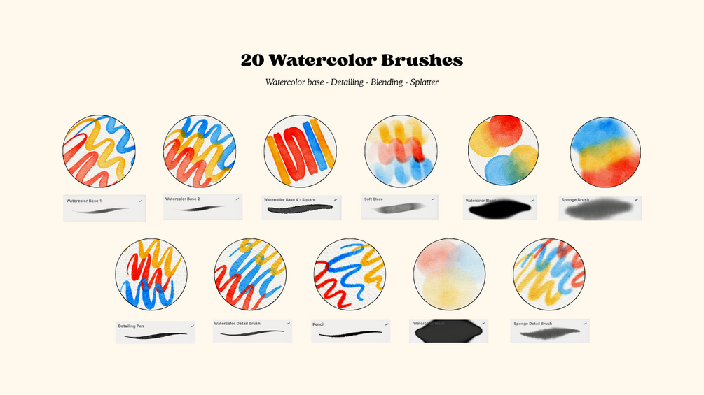 20 Watercolor Brushes for Procreate + 3 Realistic Canvases
